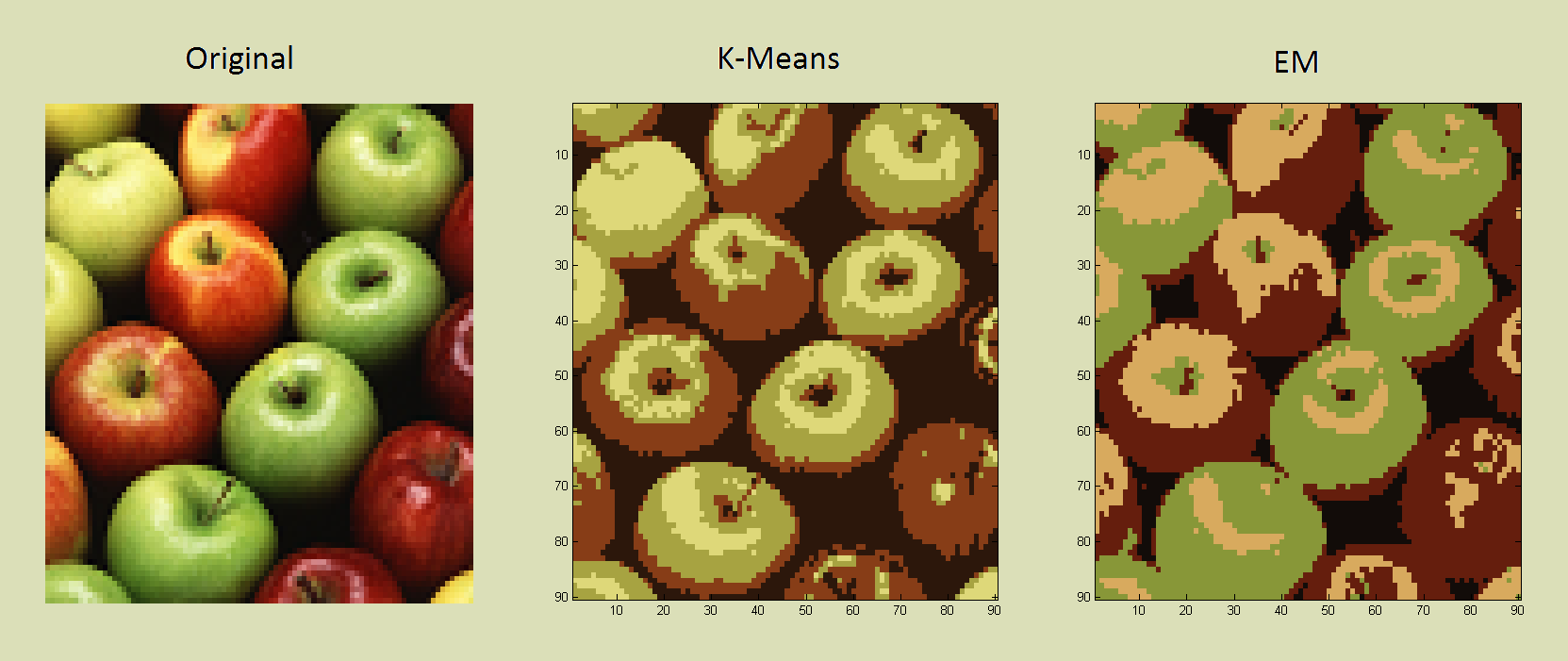 In most image compression, K-means seemed a better choice than EM. In particular, sharp details were clearer (notice the apple stems below). But, as in the gradient example, EM did a better of job at times of keeping similar colors distinct. Note the different apple varieties, using only 4 colors.